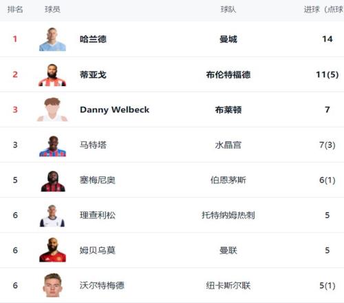 金靴的争夺无疑哈兰德是头号热门。他13场联赛打进了14粒进球,场均进球数超过1球。不过,近段时间他的状态有些低迷,各项赛事连续3场比赛都没有进球,包括2场联赛和1场欧冠比赛。哈兰德虽然在射手榜占据优势,但并不是没有竞争对手。本赛季出现了一名天才射手,他13场打进了11球,排名射手榜第2,紧追哈兰德。他就是布伦特福德的前锋伊戈尔-蒂亚戈。